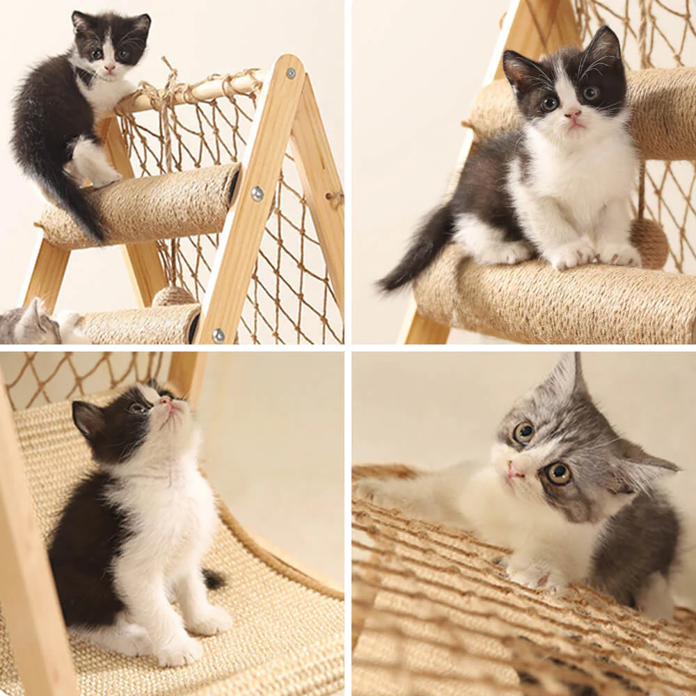 Modern Wooden Cat Tree Funny Scratching Post with Hammock Climbing Net