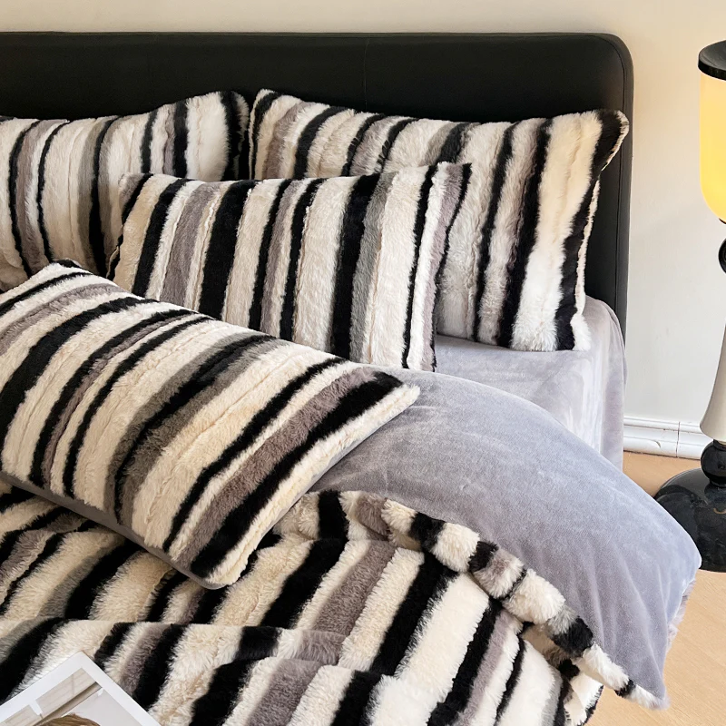 Irregular Ombre Striped Warm Thick Faux Rabbit Fur Anti-Static Bed Sheet Set